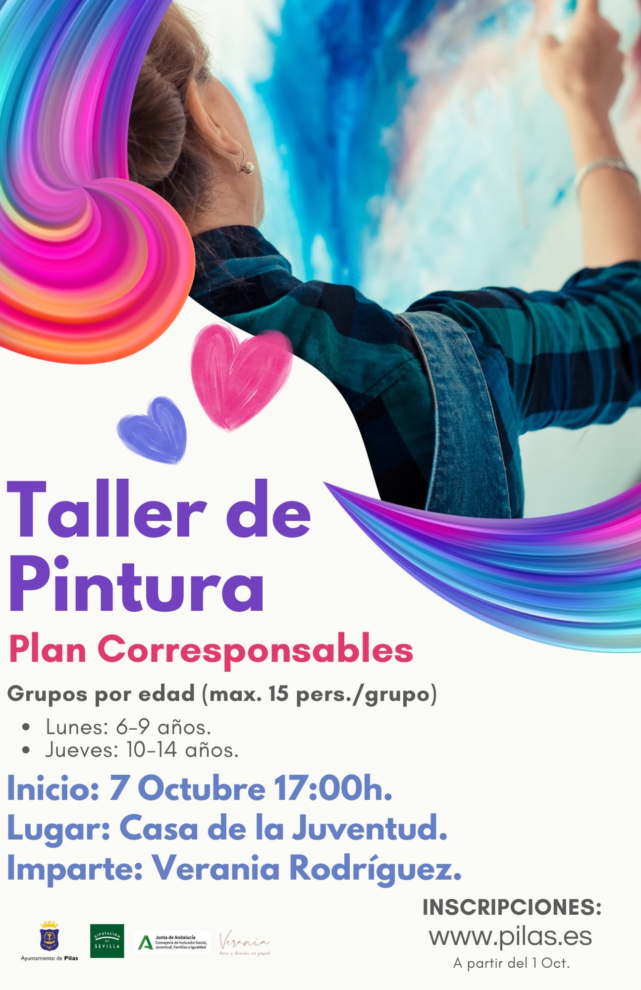 Dentro del Plan Corresponsables, al que se ha adherido el Ayuntamiento de Pilas, y que pretende articular mecanismos para el apoyo específico de las necesidades de conciliación de las familias con niñas, niños y jóvenes de hasta 16 años de edad, la Delegación de Bienestar Social pone en marcha un Taller de Pintura, dirigido a niños y niñas de entre 6 y 14 años, divididos en dos grupos de edad, e impartidos por Verania Rodríguez.