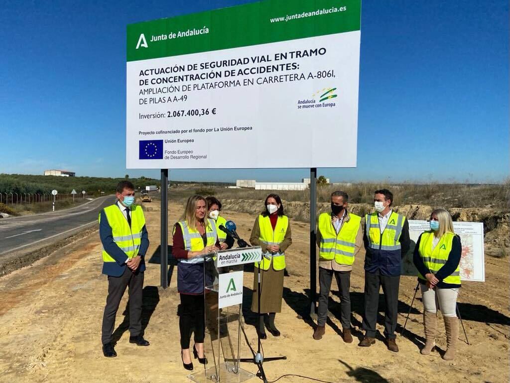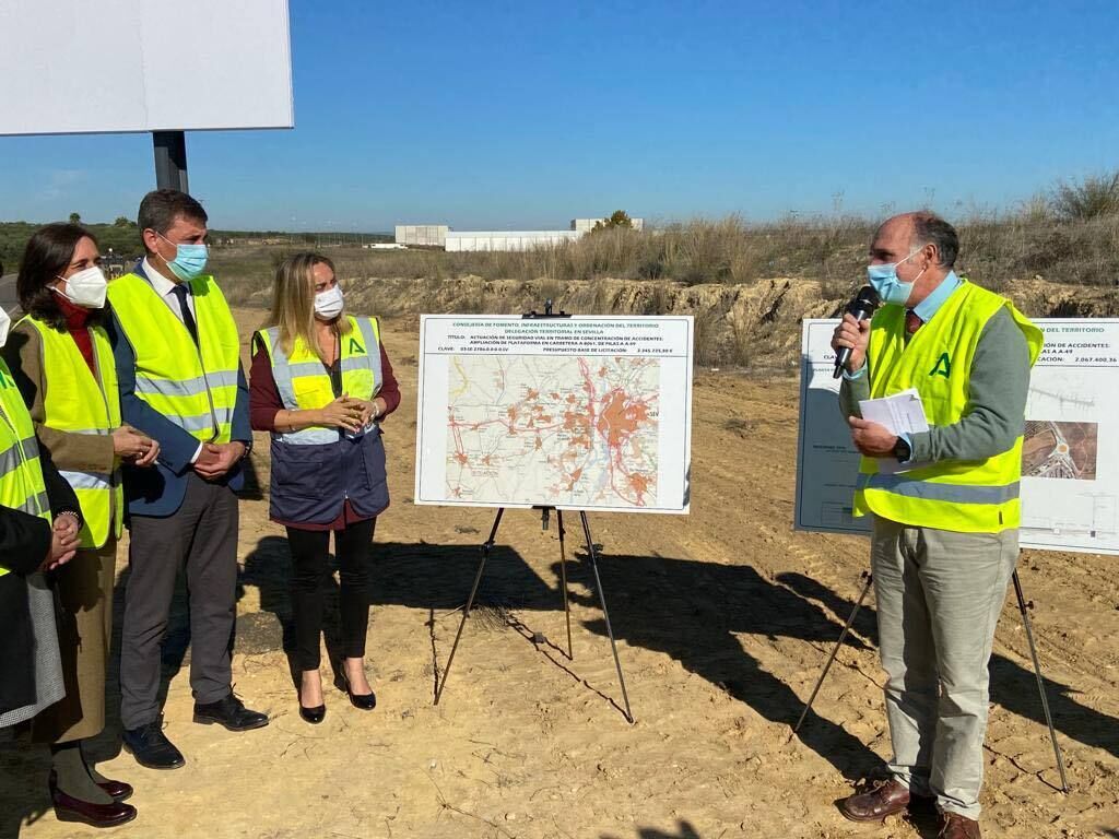 El acto, al que han asistido la delegada territorial de Fomento, Susana Cayuelas, los alcaldes de Carrión de los Céspedes y Huévar del Aljarafe, y la presidenta de la Asociación Empresarial de Pilas, Manoli Diago, ha servido para explicar a los presentes el esquema trazado para el desarrollo de las obras, gracias a las cuales, se renovará un tramo de 6 kilómetros de la vía, con el ensanchamiento de la misma y la remodelación de los accesos a la variante de Pilas y al cruce del ramal de Huévar.
