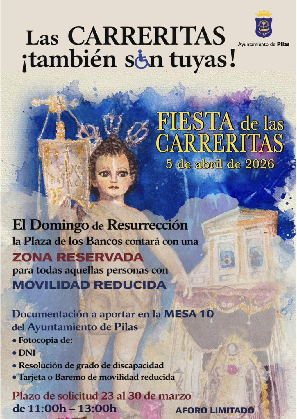 Un nuevo año, ¡Las Carreritas también son tuyas! Zona reservada. Con el objetivo de acercar nuestro Día Grande a todos los vecinos de Pilas que sufren problemas severos de movilidad, desde el Ayuntamiento volvemos a lanzar esta campaña. Zona especial habilitada. Plazo de solicitud: del 23 al 30 de marzo, de 11.00 a 13.00 horas en la Mesa 10 del Ayuntamiento.