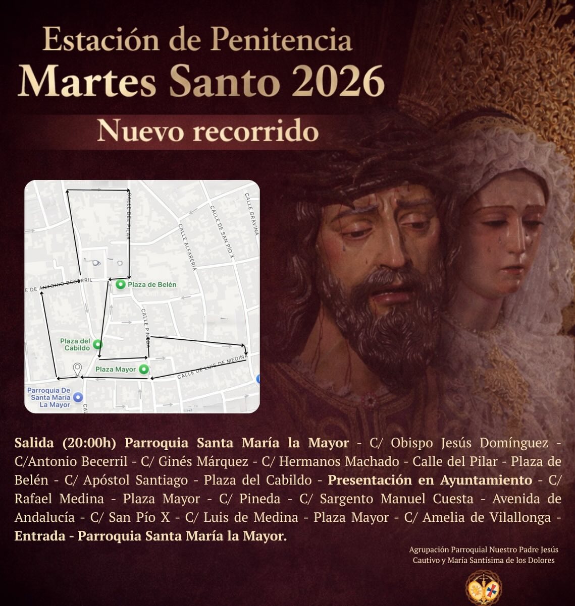 MARTES SANTO: "El CAUTIVO" / SALIDA: 20.00 HORAS - ENTRADA: 12.30 HORAS (Palio). Cambios en el recorrido de este año especificados en una de las imágenes que adjuntamos más abajo.
