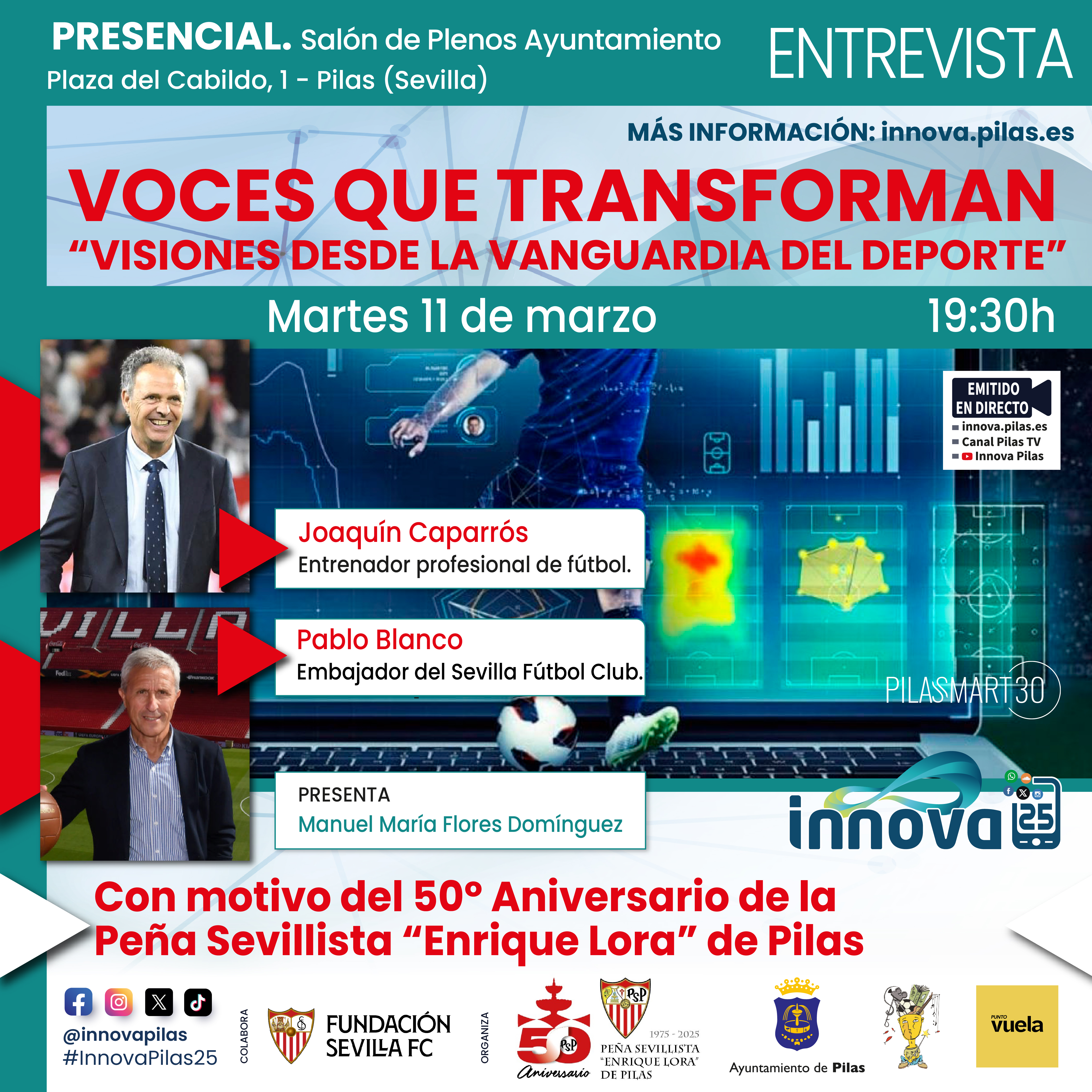 Todas ellas podrán seguirse de forma presencial en el salón de plenos del Ayuntamiento de Pilas, así como en streaming a través de las diferentes plataformas municipales, entre ellas la página web de InnovaPilas: innova.pilas.es, donde se encuentra además la programación completa.
