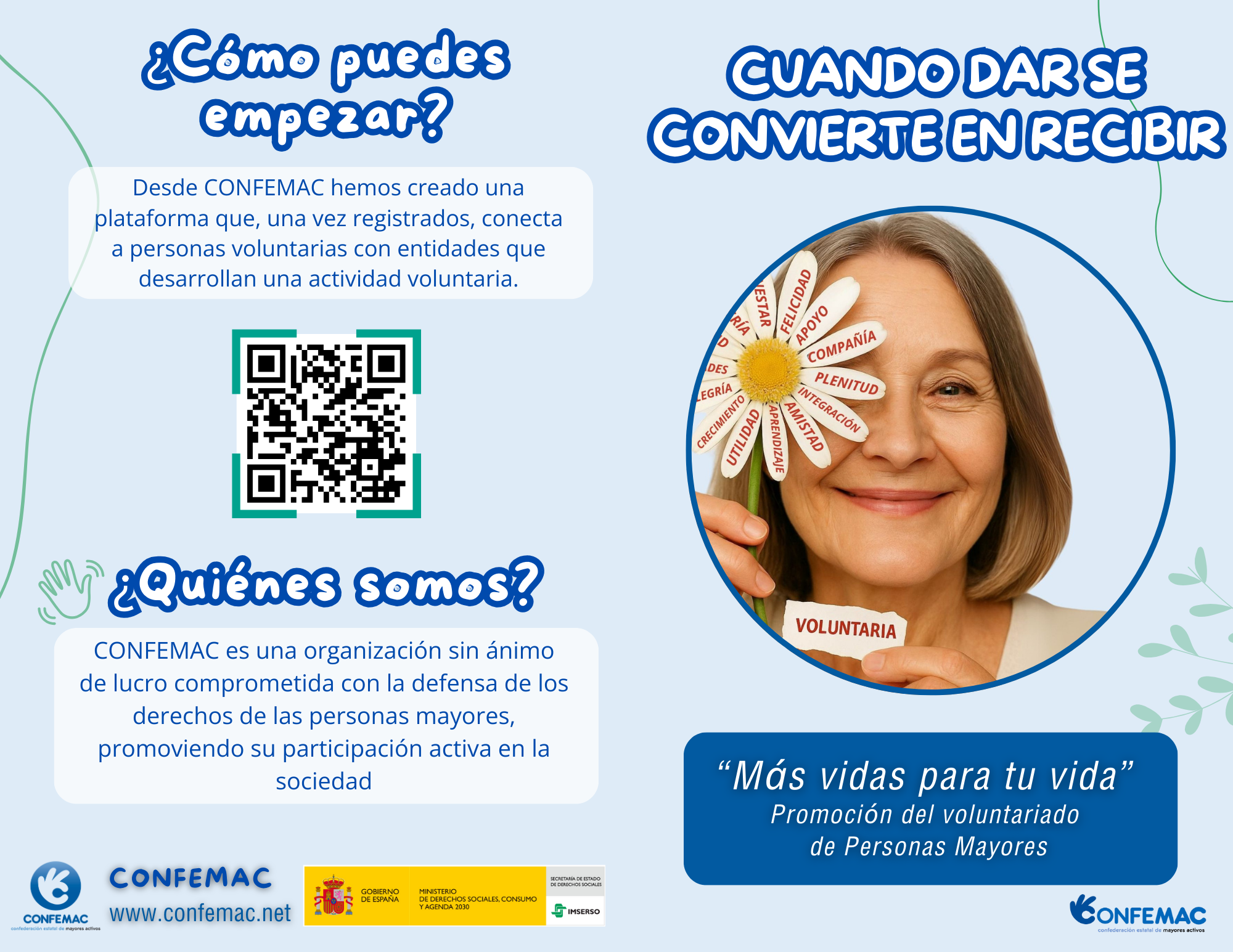 La Confederación Estatal de Mayores Activos (CONFEMAC) presenta la segunda campaña del programa estatal “Más VIDAS para tu VIDA”, destinada a promover el voluntariado organizado entre las Personas Mayores. Esta segunda campaña, amparada bajo el lema “Cuando dar se convierte en recibir”, pone el foco en los beneficios emocionales, mentales y físicos que el voluntariado aporta a quienes lo practican.