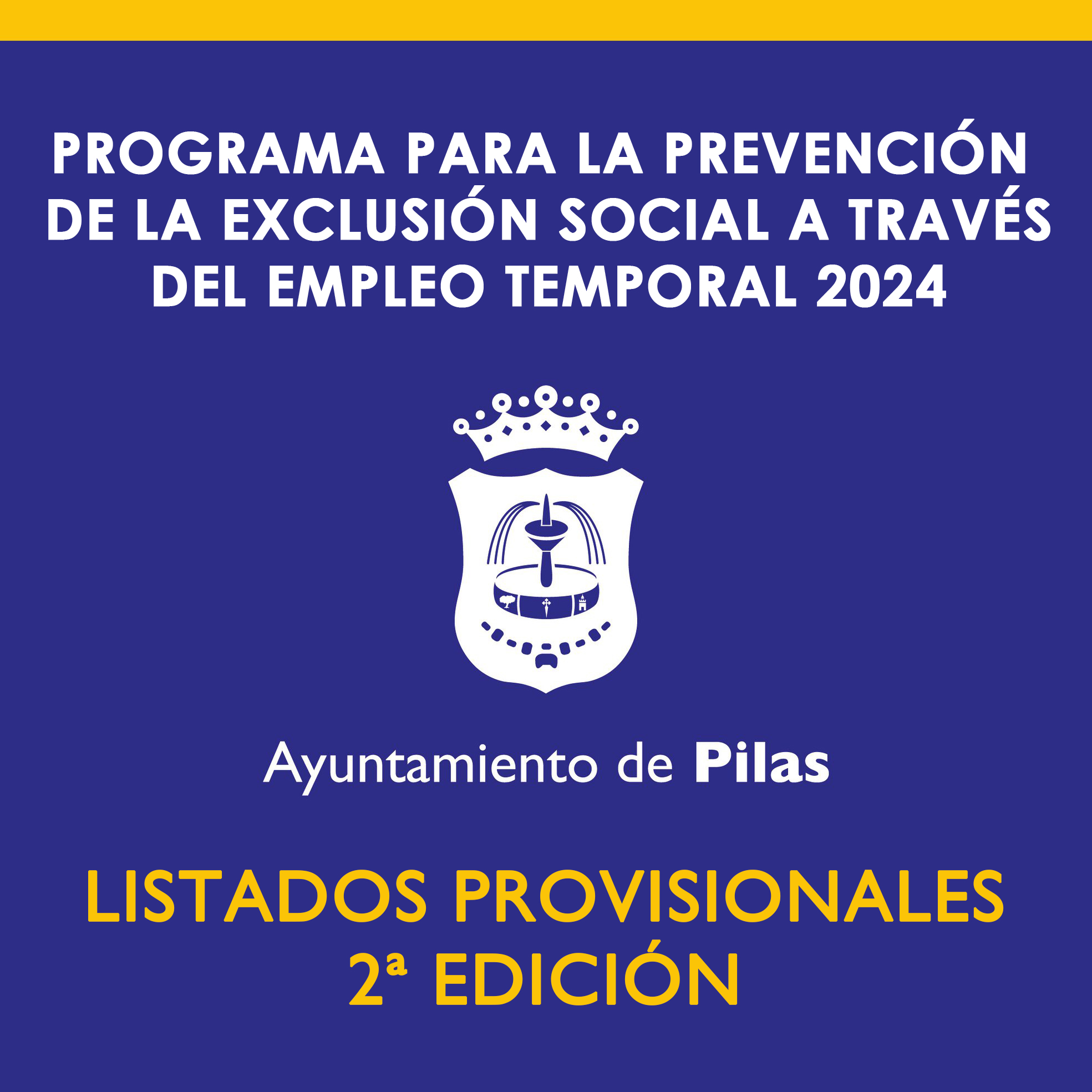 Por la presente se hace público el listado provisional de solicitantes del Programa para la Prevención de la Exclusión Social 2024 2ª Edición, así como la situación en la que se encuentran, cuyas bases fueron aprobadas inicialmente por resolución de Alcaldía nº 2024-1257 de 05/08/24, posteriormente refundidas y ampliadas en la Resolución de Alcaldía 2024-1705 de 28/10/24 y de conformidad con resolución de la Presidencia de la Diputación Provincial nº 4783/2024 de 29 de julio de 2024, por la que se aprobó la concesión y distribución de las ayudas, que se utilizarán para ofrecer contrataciones de carácter temporal a personas que padezcan problemáticas socioeconómicas graves, de acuerdo con lo previsto en el artículo 2 de las bases de la convocatoria, hasta agotar créditos.