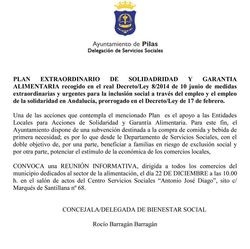 La concejala de Bienestar Social, Rocío Barragán, convoca una reunión informativa, dirigida a todos los comercios del municipio que se dediquen al sector alimentario, el próximo 22 de diciembre a las 10.00 horas en el Centro de Servicios Sociales.