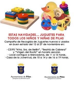 Estas Navidades... Juguetes para todos los niños y niñas de Pilas. Este es el lema del nuevo movimiento solidario organizado por las Delegaciones de Bienestar Social y Juventud. El Ayuntamiento de Pilas agradece vuestra colaboración, para que ningún niño se quede sin su regalo de Navidad. Plazo: del 12 al 27 de noviembre.