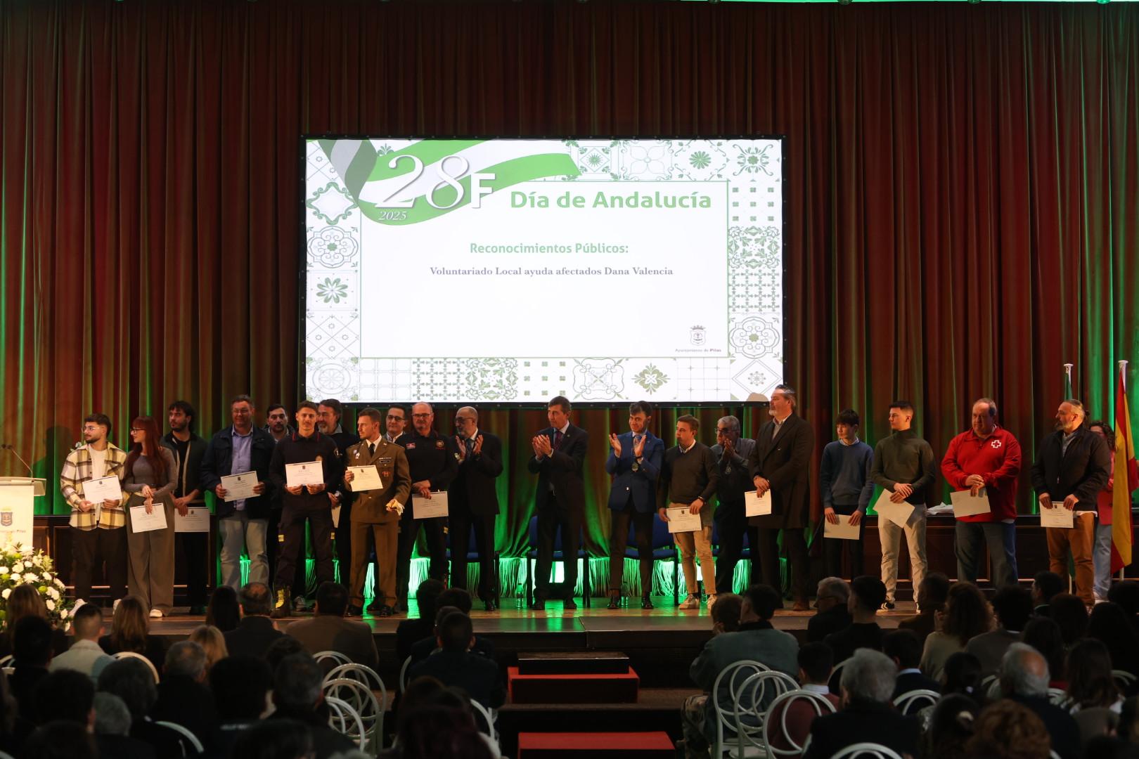 Uno de los momentos más emotivos de la jornada fue el reconocimiento a las personas voluntarias que se desplazaron hasta Valencia en los peores momentos tras la DANA, de manera totalmente altruista, para ayudar a los damnificados, teniendo lugar en el acto un sentido recuerdo a todas las víctimas de la catástrofe. El broche de oro de este tradicional acto institucional, emitido en directo por esta página web, por la página oficial del Ayuntamiento en Facebook y por Canal Pilas TV, fue la magistral interpretación del Himno de Andalucía por parte de la Sociedad Filarmónica de Pilas y su Bandita, que puso en pie al numeroso público asistente.
