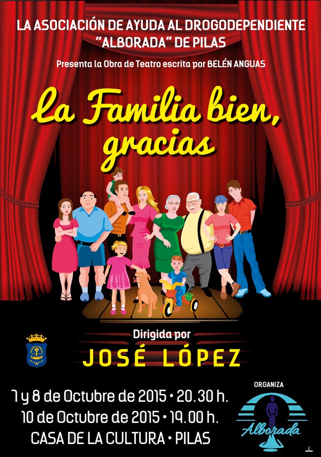 La asociación Alborada, en colaboración con el Ayuntamiento de Pilas, presenta la obra de teatro escrita por la pileña Belén Anguas y dirigida por José López "La familia, bien gracias", que se representará en la Casa de la Cultura los días 7, 8 (20.30 h) y 10 de octubre (19.00 h).