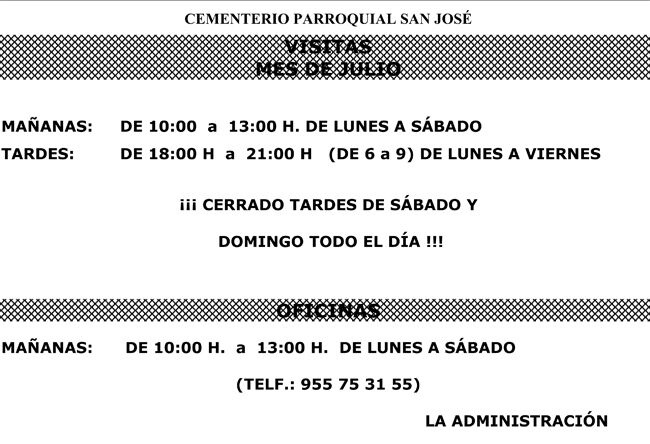 Horario de visitas del Cementerio Parroquial San José para el mes de julio