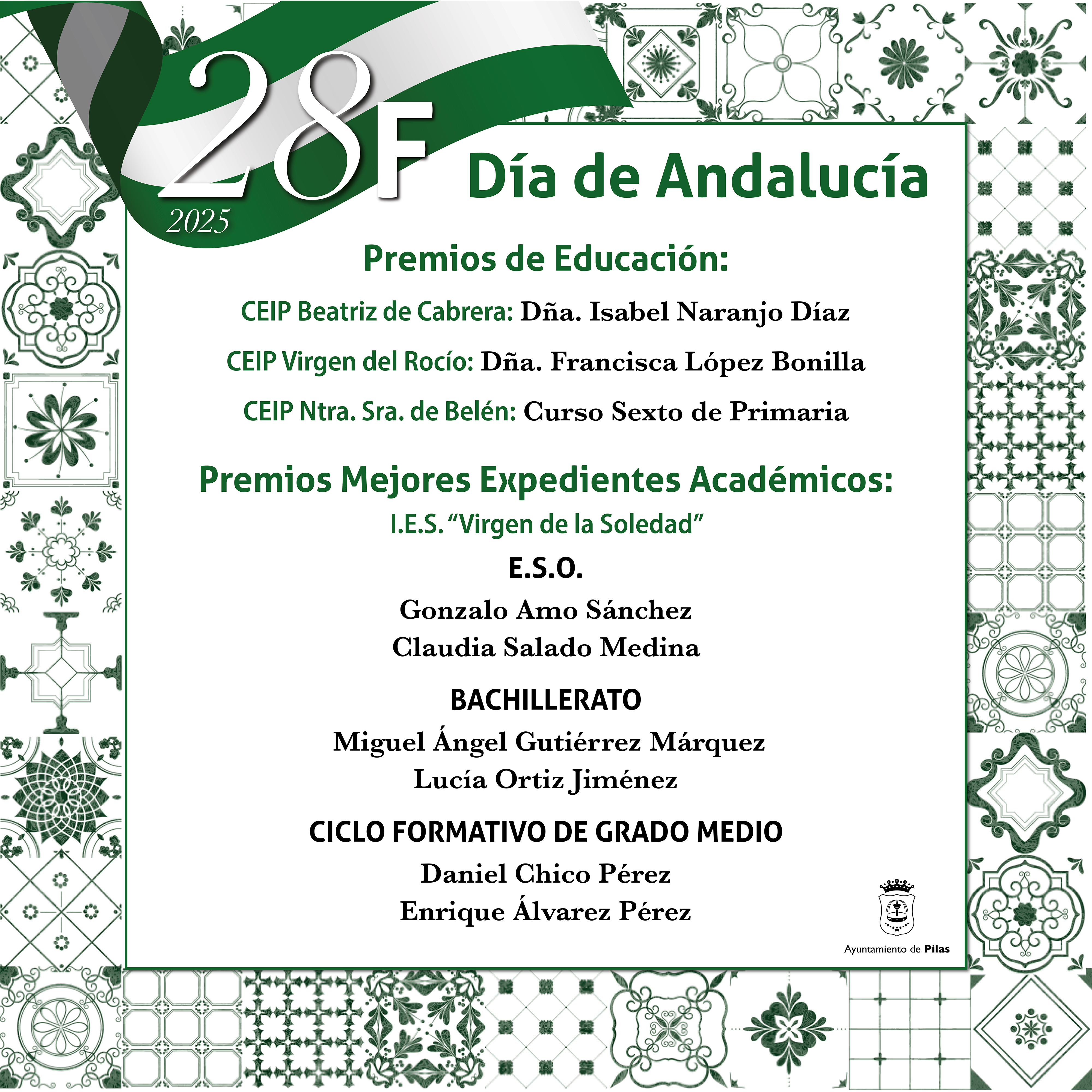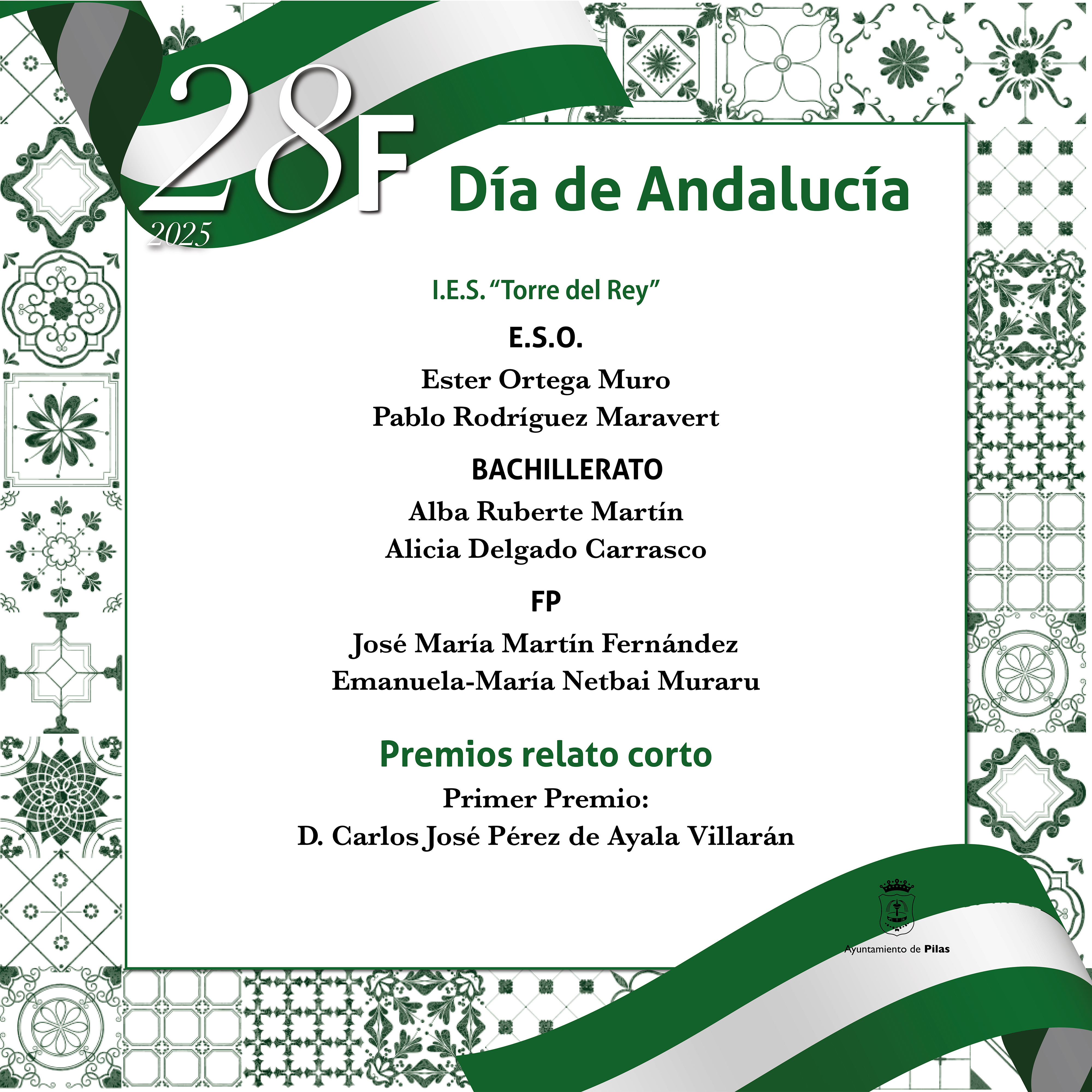 Del mismo modo, tendrá lugar la entrega de los premios de Educación y de los reconocimientos al alumnado con mejor expediente de los dos institutos, así como a los ganadores del XXXVII Certamen de Relato Corto Biblioteca Pública Municipal de Pilas.