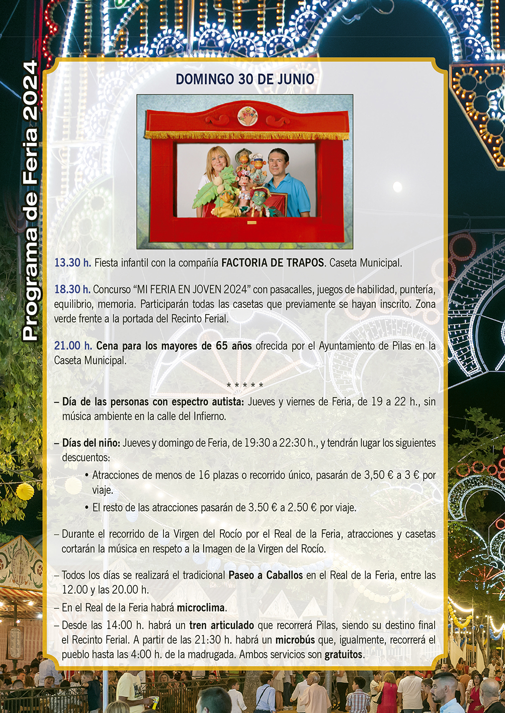 Nuevamente este año, el Ayuntamiento pone en marcha un servicio gratuito de tren y microbús para el desplazamiento hasta el Real (información en las imágenes de más abajo), así como los Días de las Personas con espectro autista (jueves y viernes de Feria, de 19.00 a 22.00 h.), sin música ambiente en la calle del Infierno, y los Días del Niño, que serán jueves y domingo de Feria, de 19.30 a 22.30 h., y tendrán lugar los siguientes descuentos: