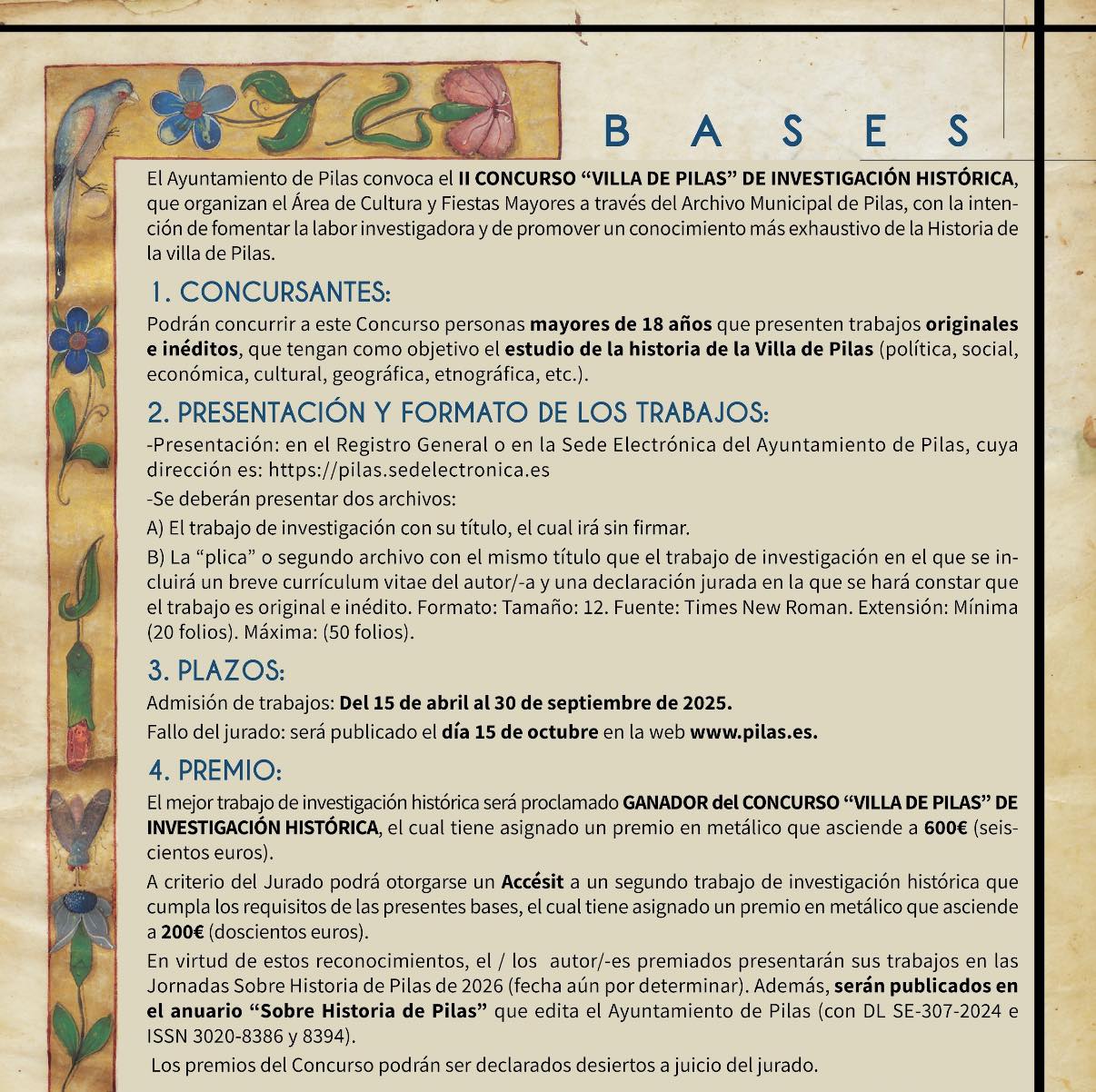 Los trabajos premiados serán presentados en la próxima edición de las Jornadas sobre Historia de Pilas, a celebrar durante el primer trimestre de 2026.