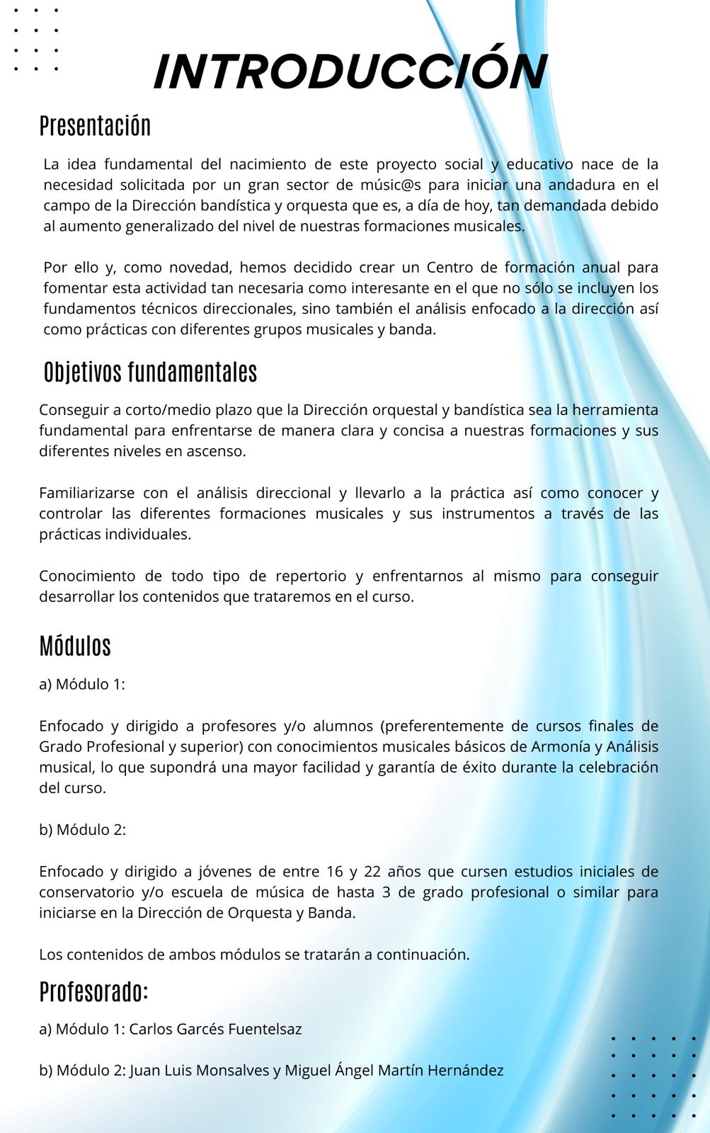 Presentamos este interesante proyecto que se iniciará en nuestro municipio de cara al curso 2024/2025 y que contará con el reconocido profesor y director Carlos Garcés Fuentelsaz, uno de los máximos exponentes en el mundo de la dirección a nivel europeo, para la impartición de las clases teóricas y prácticas.