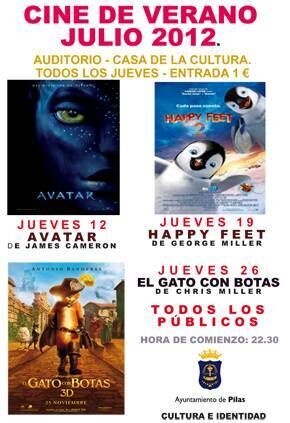 Los jueves de este verano, en el Auditorio de la Casa de la Cultura, disfruta del mejor cine para todos los públicos. Julio: jueves 12 "Avatar", jueves 19 "Happy Feet 2" y jueves 26 "El Gato con Botas". Agosto: jueves 2 "Alvin y las Ardillas 3" y jueves 9 "La Guerra de los Botones". Precio de la entrada: 1 euro. Hora de proyección: 22.30. Organiza: Delegación de Cultura e Identidad del Ayuntamiento de Pilas.
