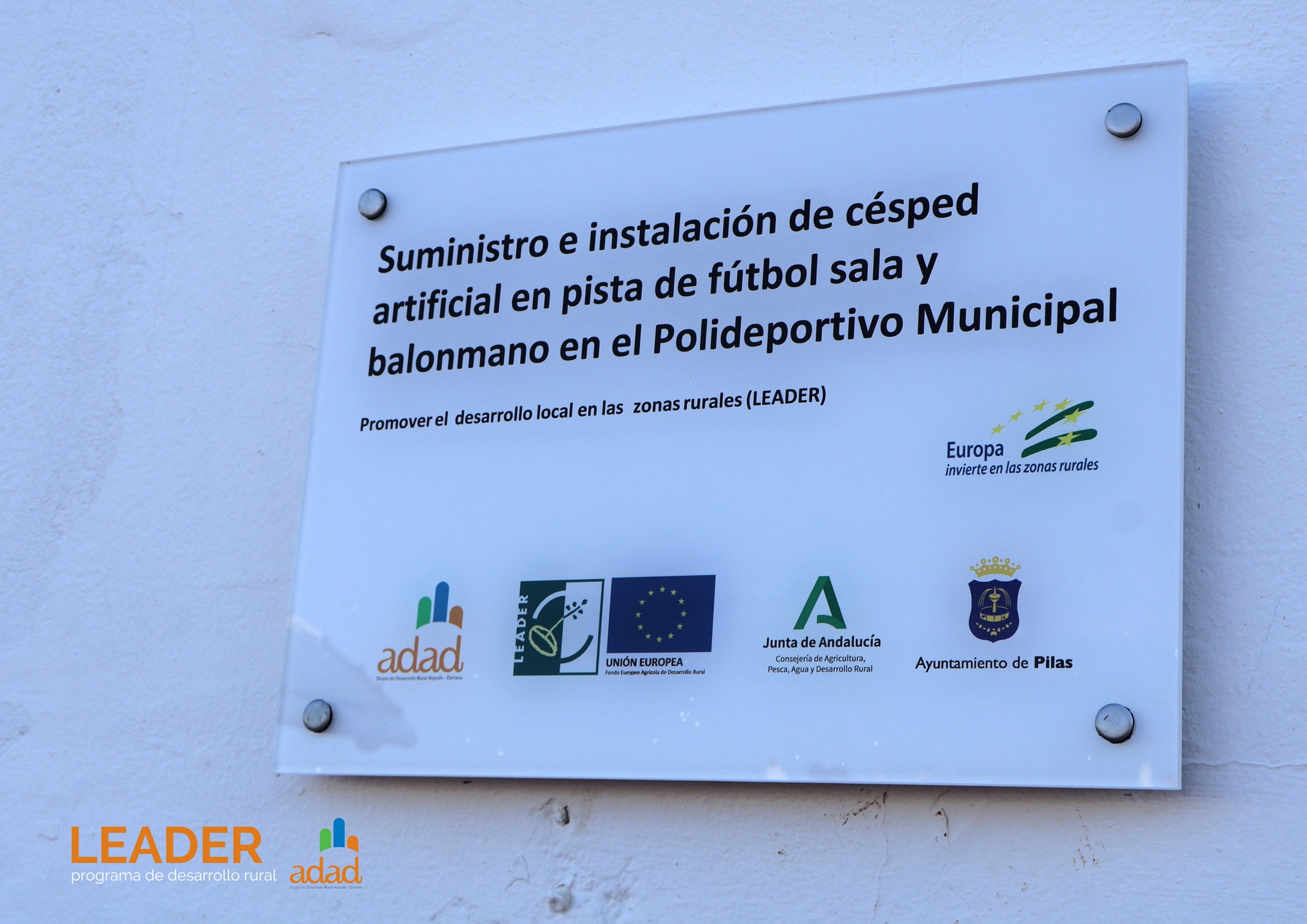 Desde el Ayuntamiento de Pilas hemos llevado a cabo, con el apoyo del programa LEADER que gestiona el Grupo de Desarrollo Rural Aljarafe-Doñana (ADAD) y cofinancia el FEADER de la Unión Europea y la Consejería de Agricultura, Pesca, Agua y Desarrollo Rural de la Junta de Andalucía, dos actuaciones en instalaciones deportivas municipales.