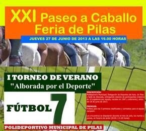 El Ayuntamiento de Pilas, a través de la Delegación de Deportes, organiza el XXI Paseo a Caballo Feria de Pilas, que será el jueves 27 de junio, y colabora en el I Torneo de Verano de Fútbol 7 "Alboraba por el Deporte", cuyo plazo de inscripción permanecerá abierto hasta el 28 de junio.