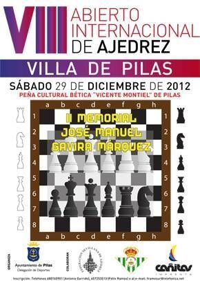 La Delegación de Deportes del Ayuntamiento de Pilas organiza el VIII Abierto Internacional de Ajedrez "Villa de Pilas", que tendrá lugar el SÁBADO 29 DE DICIEMBRE DE 2012 en la PEÑA CULTURAL BÉTICA "VICENTE MONTIEL" DE PILAS, Avenida Pío XII, 32.