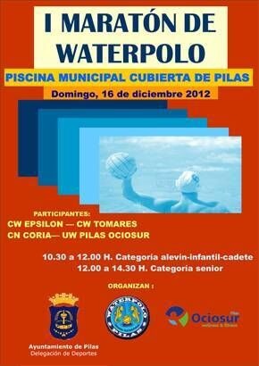 Próximo domingo 16 de diciembre en la Piscina Cubierta Municipal. Desde las 10.30 hasta las 14.30 horas. Organizan: Delegación de Deportes del Ayuntamiento de Pilas, Unión de Waterpolo Pilas y Ociosur.