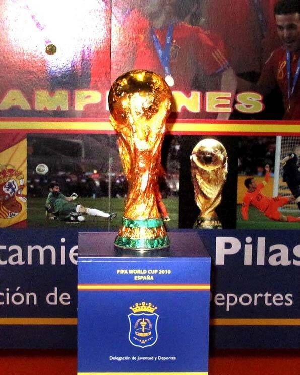 Esta mañana nuestro pueblo ha podido disfrutar de la Copa del Mundo que la Selección Española ganó en el Mundial de Suráfrica 2010. Niñ@s y mayores han posado con el preciado trofeo. Además, el Presidente de la Federación Sevillana de Fútbol, Pedro Borrás, hizo entrega a la Delegada de Deportes, Juani Rodríguez, de diez balones de fútbol para nuestras escuelas deportivas.
