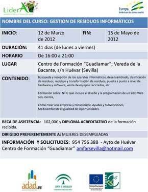 El 12 de marzo comienza en el Centro de Formación Guadiamar de ASAJA, en Huévar del Aljarafe, un curso sobre Gestión de Residuos Informáticos organizado por la Asociación de Mujeres y Familias del Ámbito Rural (AMFAR-Sevilla), con la cofinanciación del Programa LiderA. Se trata de un programa formativo de 205 horas preferentemente dirigido a mujeres desempleadas, cuyo objetivo es cualificar en la recuperación y reciclaje de material informático, un yacimiento de empleo con muchas oportunidades de desarrollo en la comarca. Ya está abierta la inscripción.