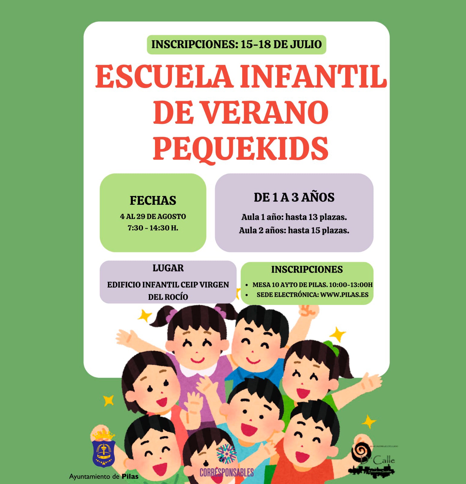 Desde el Ayuntamiento de Pilas, a través de la Delegación de Bienestar Social e Igualdad y enmarcado en el Plan Corresponsables, se pone en marcha la Escuela Infantil de Verano PequeKids, una iniciativa pensada para facilitar la conciliación de las familias durante el mes de agosto, ofreciendo un entorno seguro, lúdico y adaptado para los más pequeños del hogar.