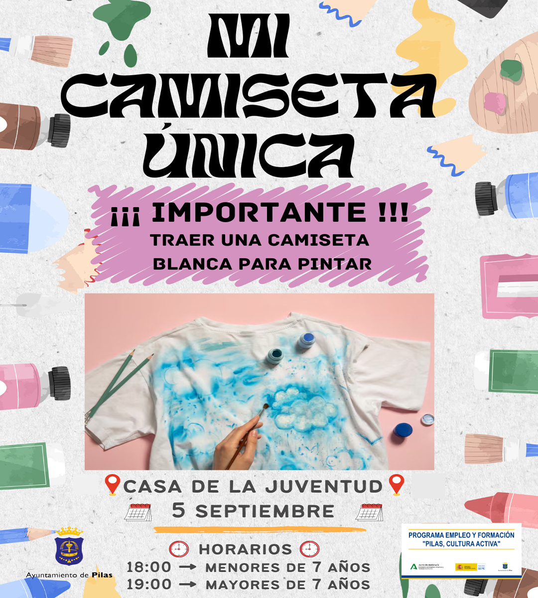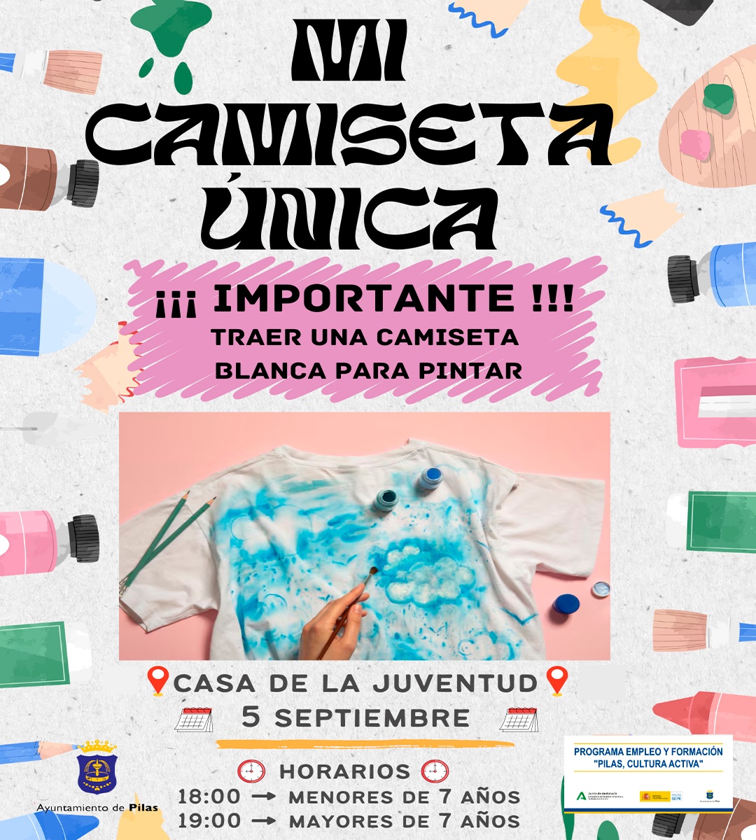La Delegación de Juventud retoma su actividad en este mes de septiembre con la organización del taller Mi camiseta única, aque se celebrará el próximo jueves, 5 de septiembre en dos turnos, de 18.00 a 19.00 (menores de 7 años) y de 19.00 a 20.00 horas (de 8 años en adelante).