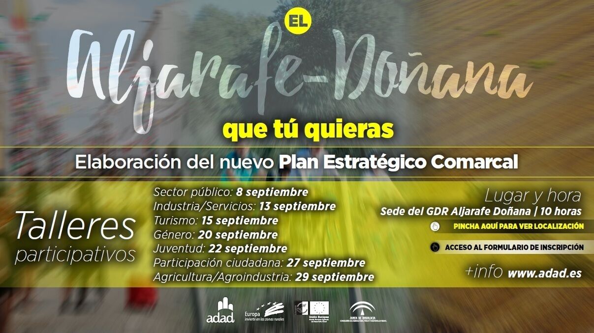 Todas estas aportaciones se validarán y enriquecerán en los distintos talleres que se celebrarán a lo largo del mes septiembre en la sede de ADAD en Pilas, y en los que se darán cita el sector público comarcal (8 septiembre), los agentes turísticos (15 septiembre), el sector de la industria y los servicios (13 septiembre), y los agentes relacionados con la agricultura y la agroindustria del Aljarafe-Doñana (29 de septiembre). Asimismo, ADAD está organizando espacios de encuentro sobre Género y Equidad de Oportunidades (20 septiembre), la Juventud de la comarca (22 septiembre) y en general sobre Articulación social y Participación de la Ciudadanía en el desarrollo comarcal (27 septiembre).