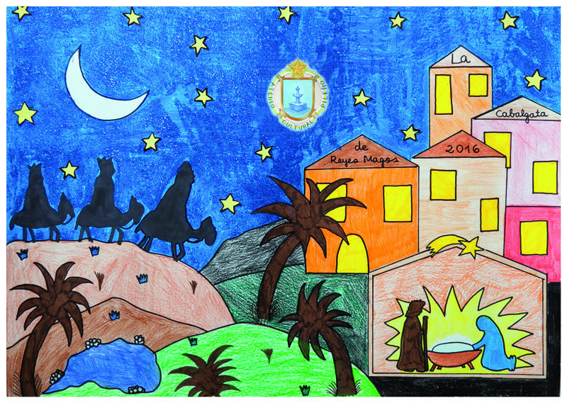 *Arriba, cartel de la Cabalgata de Reyes 2016. Dibujo de Paloma Márquez Ruiz.