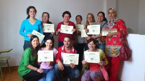 *En la imagen, los/as participantes mostrando su diploma acreditativo, acompañados/as por una de las técnicas.