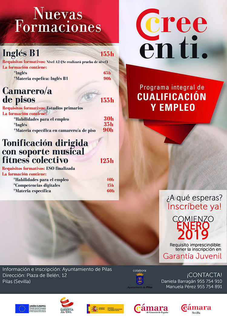 Plazo abierto hasta cubrir el número de plazas correspondientes. Las personas desempleadas inscritas y activas en el Sistema Nacional de Garantía Juvenil ya pueden inscribirse en los siguientes cursos de formación que van a desarrollarse en Pilas entre los meses de noviembre y diciembre: