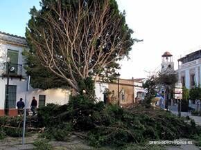 El Ayuntamiento de Pilas traslada el árbol de la Plaza Aviador Francisco Medina para garantizar la integridad de las viviendas colindantes y de la propia plaza
