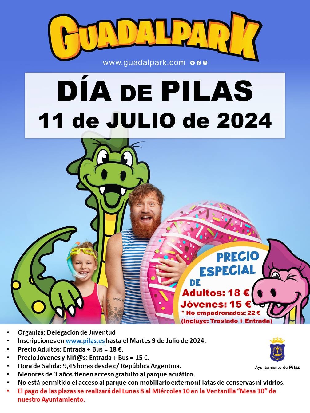 *Precio. Una vez se reciba la inscripción, se avisará a partir del 8 de julio a la(s) persona(s) inscrita(s) para realizar el pago (entrada + bus adulto = 18 €; jóvenes y niños = 15 €). El pago deberá realizarse del 8 al 10 de julio en la Mesa 10 del Ayuntamiento, en horario de 9.00 a 13.00.