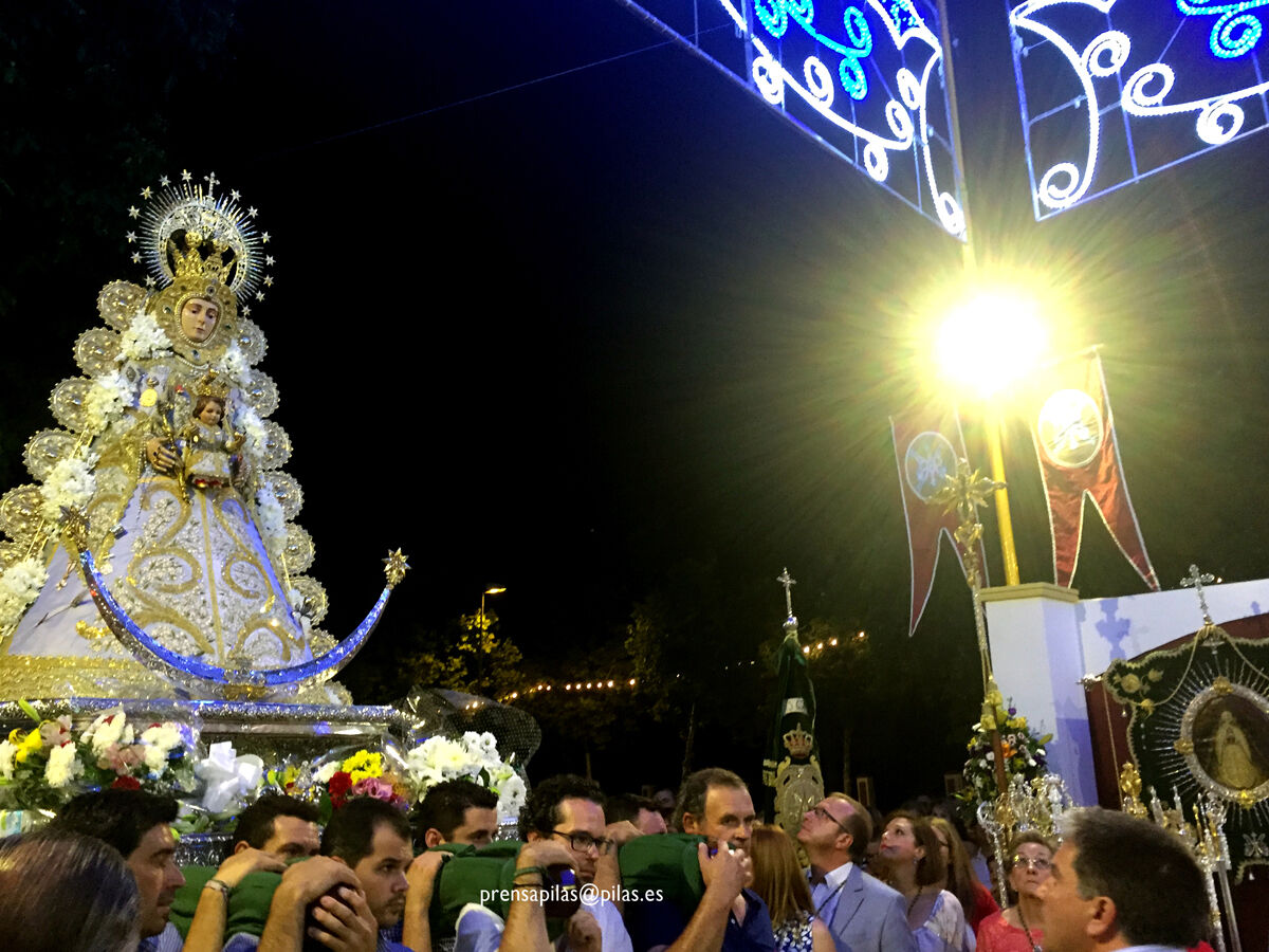 Tras la misa celebrada en la Iglesia Santa María la Mayor comenzó la procesión, en cuyo cortejo estuvo presente un grupo de tamborileros, la Cruz de Guia de la Hermandad, una representación de los Grupos Jóvenes de las Hermandades del Rocío de Marchena, Chucena, Paterna del Campo, Asociación Parroquial Cristo del Amor de Pilas y de Jesús Cautivo de Pilas, Hermandades de la Soledad, de Belén y del Rocío de Pilas así como los Simpecados de las Hermandades ahijadas de la de Pilas: Marchena, Chucena y Paterna del Campo y los Simpecados de la Hermandad del Rocío dePilas.