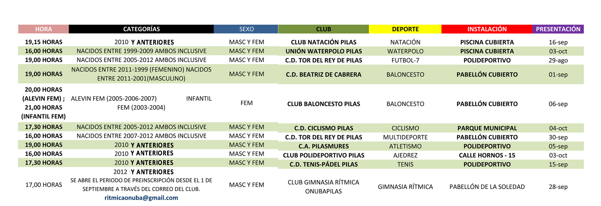 En este enlace se puede consultar y/o descargar las fechas y horarios de presentación de los distintos clubes deportivos: