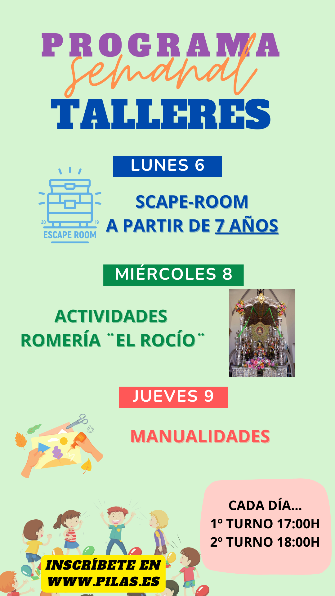 La Delegación de Juventud organiza una serie de talleres que se desarrollarán durante la primera semana de mayo, en concreto los días 6, 8 y 9: Escape Room, para niños y niñas mayores de 7 años, Actividades relacionadas con la Romería del Rocío y Manualidades, estos últimos para niños y niñas de todas las edades.