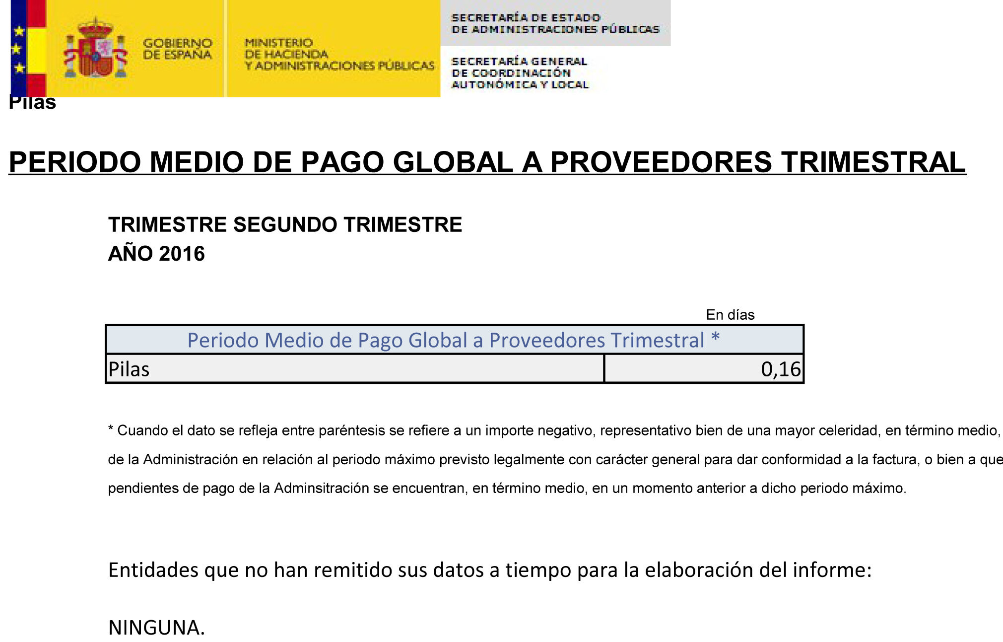 Período medio de pago global a proveedores del Ayuntamiento de Pilas en el segundo trimestre de 2016