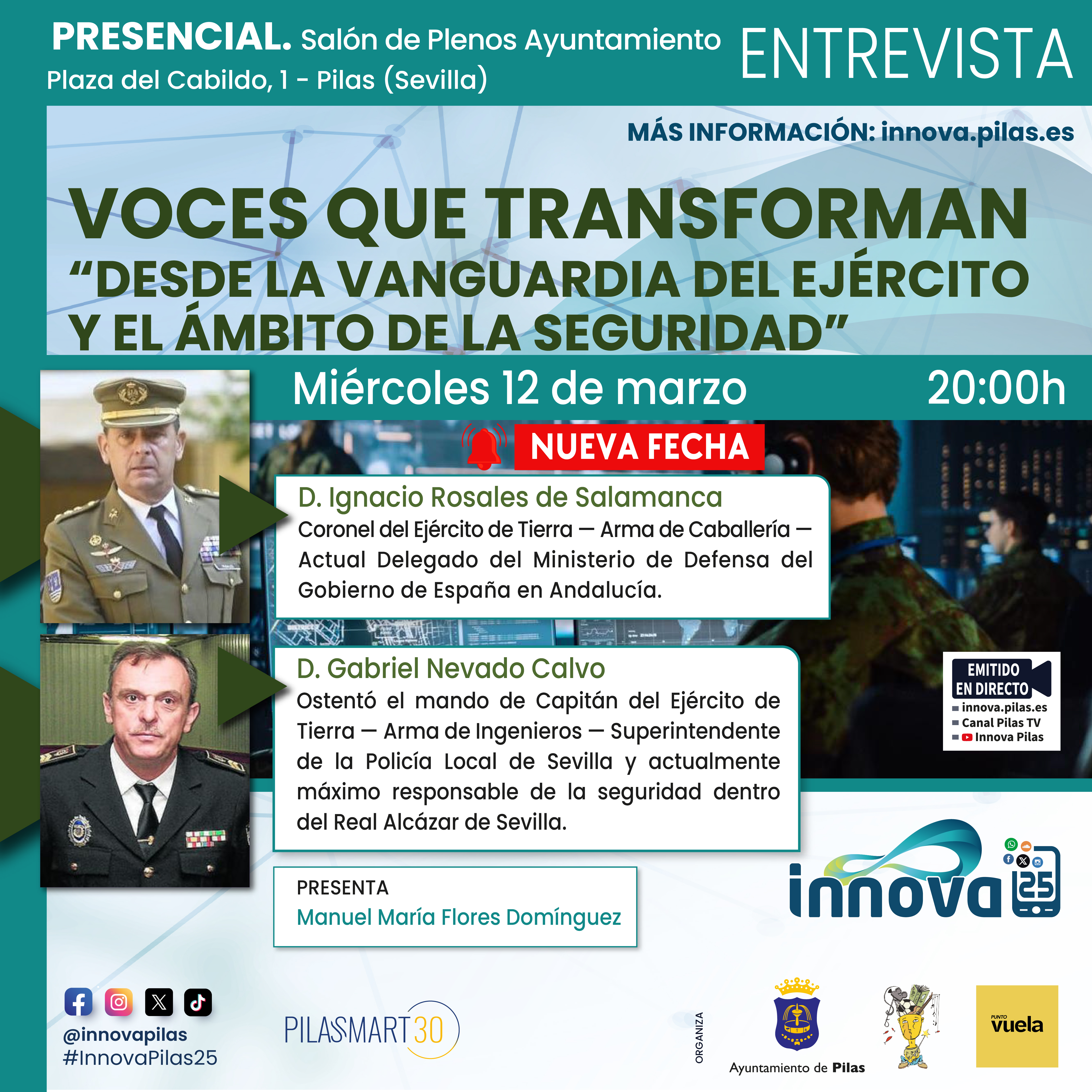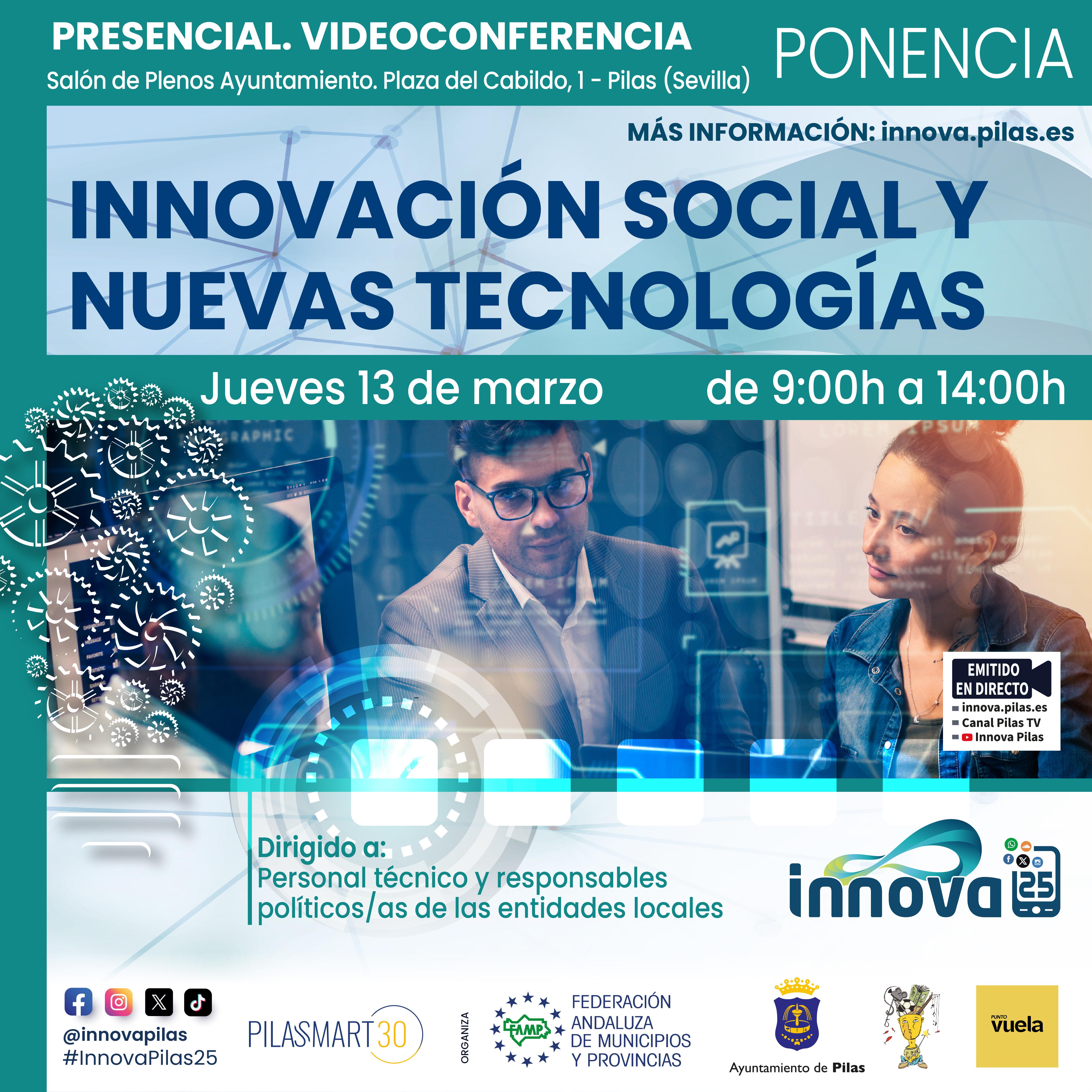 Todas ellas podrán seguirse de forma presencial en el salón de plenos del Ayuntamiento de Pilas, así como en streaming a través de las diferentes plataformas municipales, entre ellas la página web de InnovaPilas: innova.pilas.es, donde se encuentra además la programación completa.