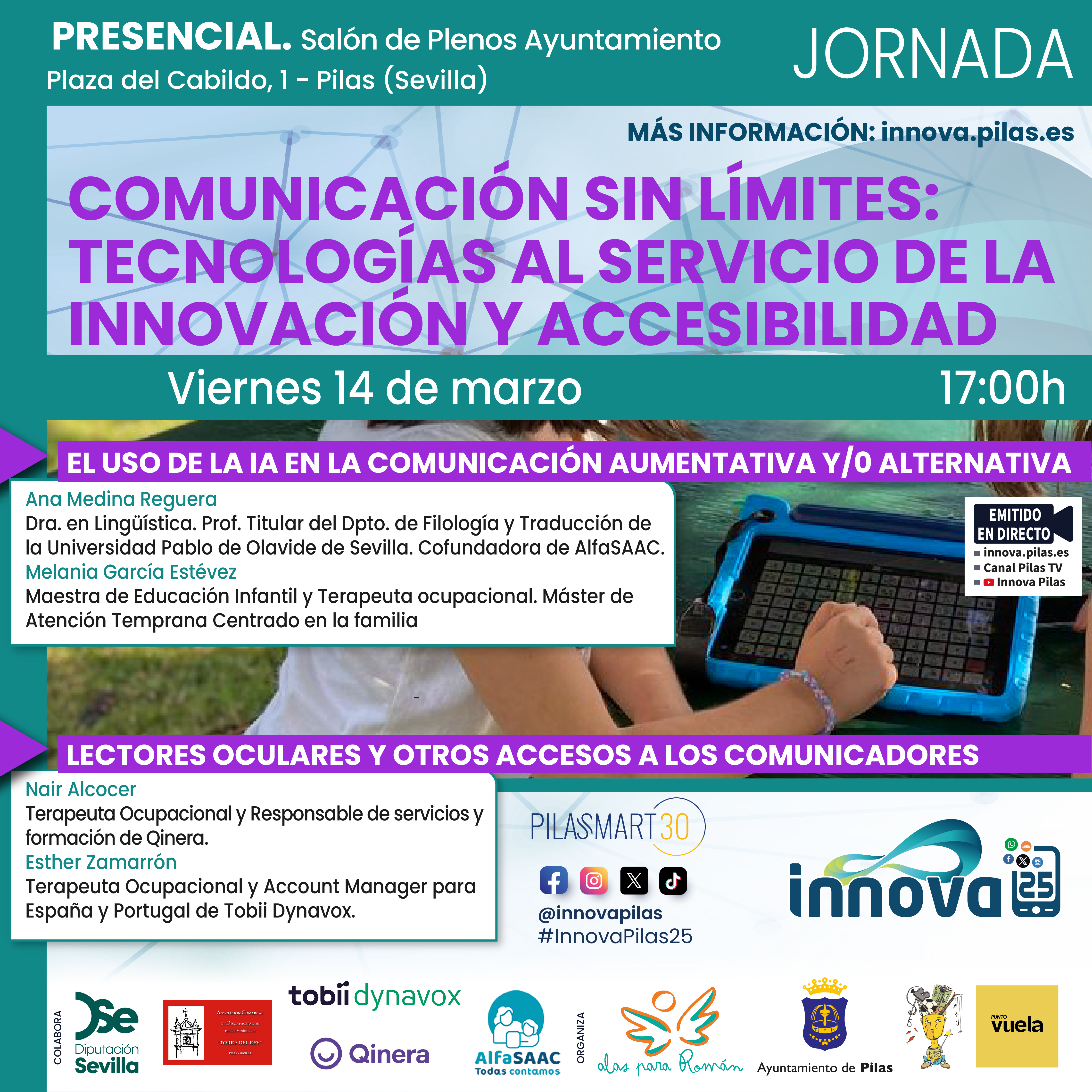 Viernes 14, 17:00h. Jornada: COMUNICACIÓN SIN LÍMITES: TECNOLOGÍAS AL SERVICIO DE LA INNOVACIÓN Y ACCESIBILIDAD..