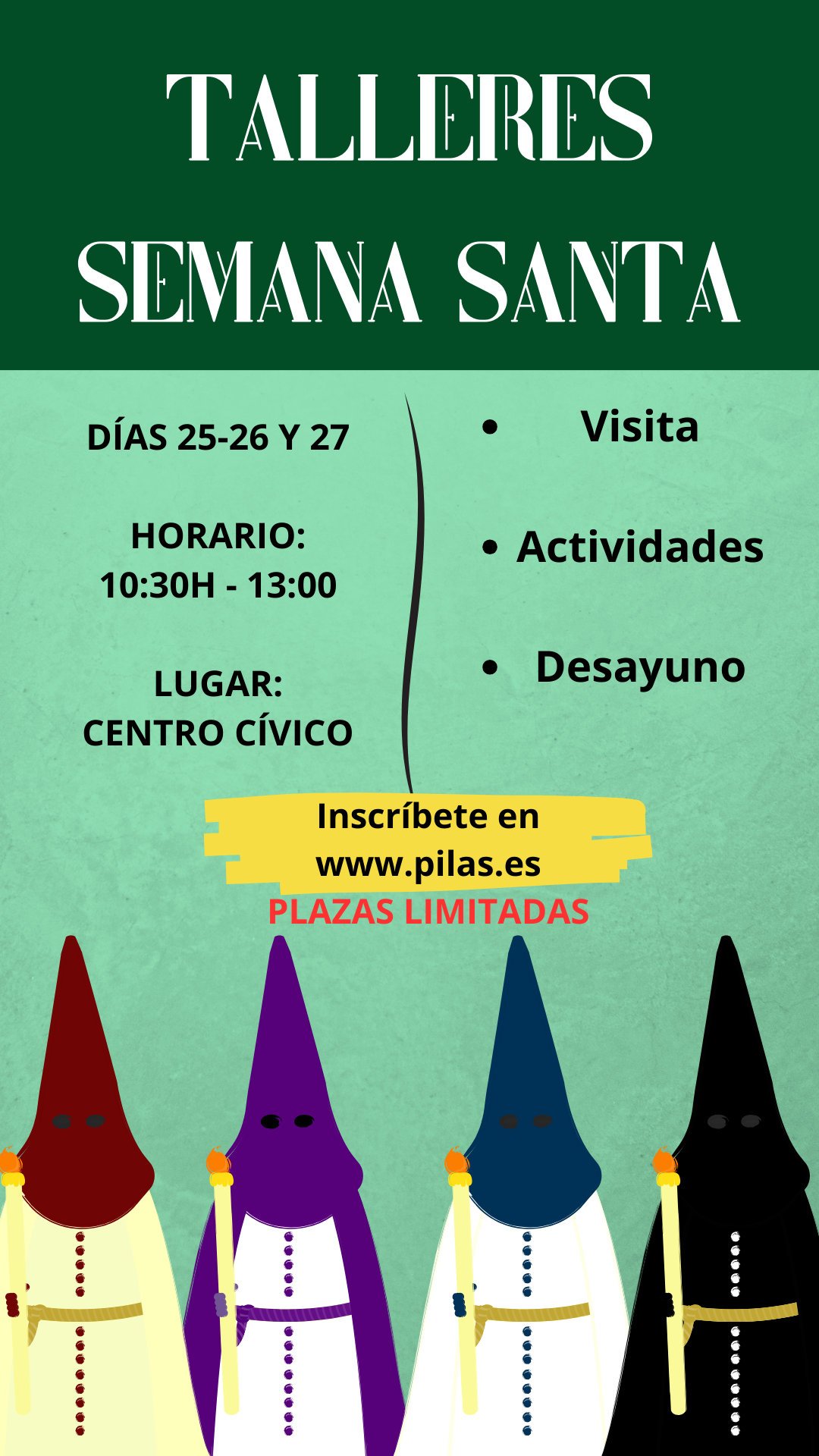 La Delegación de Juventud organiza diferentes actividades para Lunes, Martes y Miércoles Santos, dirigidas niños y niñas de Pilas de todas las edades. Visitas cofrades y desayunos incluidos, así como talleres adaptados... ¡lo pasaremos de maravilla disfrutando de nuestras tradiciones!