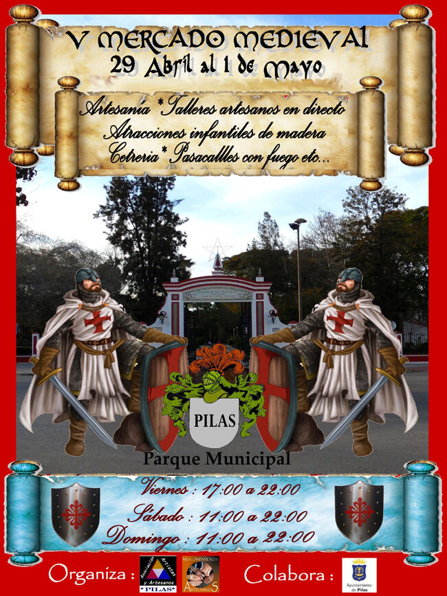 Del 29 de abril al 1 de mayo, el Parque Municipal acogerá la quinta edición del Mercado Medieval, organizado en esta ocasión por la Asociación de Artistas y Artesanos Pileños y Mis Compañeros Artesanos, con la colaboración del Ayuntamiento de Pilas.