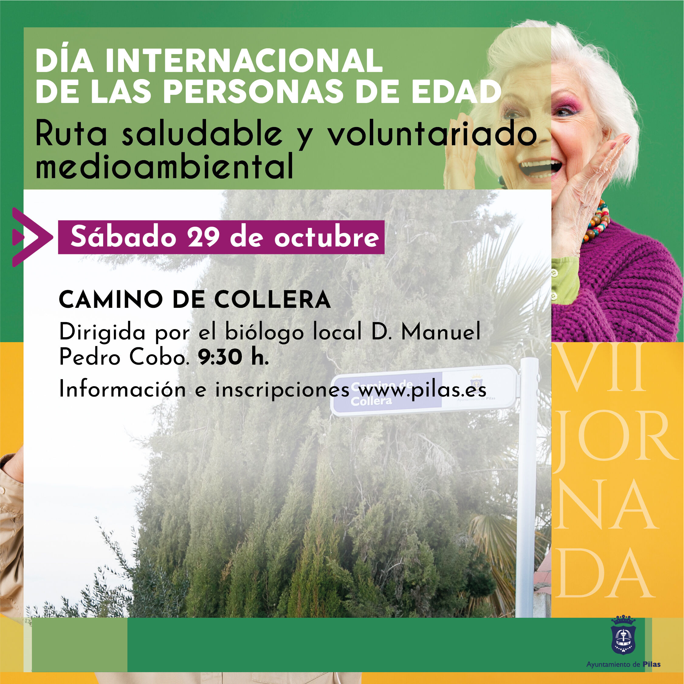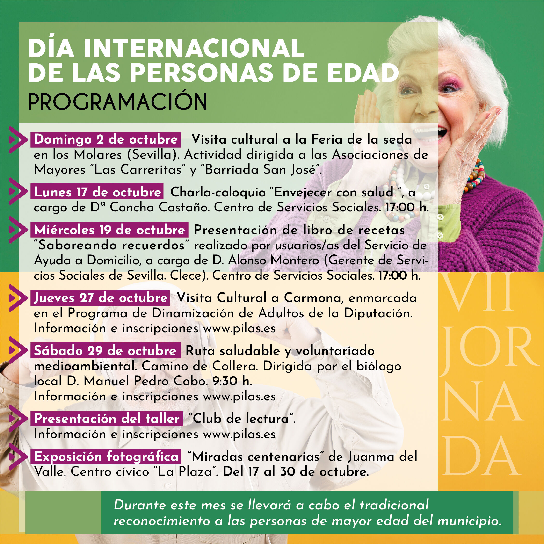 Dentro de la VII Jornada por el Día Internacional de las Personas de Edad In Memoriam de Silvia García Ávalos, reconoceremos una vez más a las personas de más edad censadas en nuestra localidad y pondremos en marcha nuevas actividades centradas en este colectivo -para las que contamos con la colaboración de la Diputación de Sevilla y de Clece, entre otros-, que detallamos en la imagen de arriba y en el resto de carteles adjuntos.