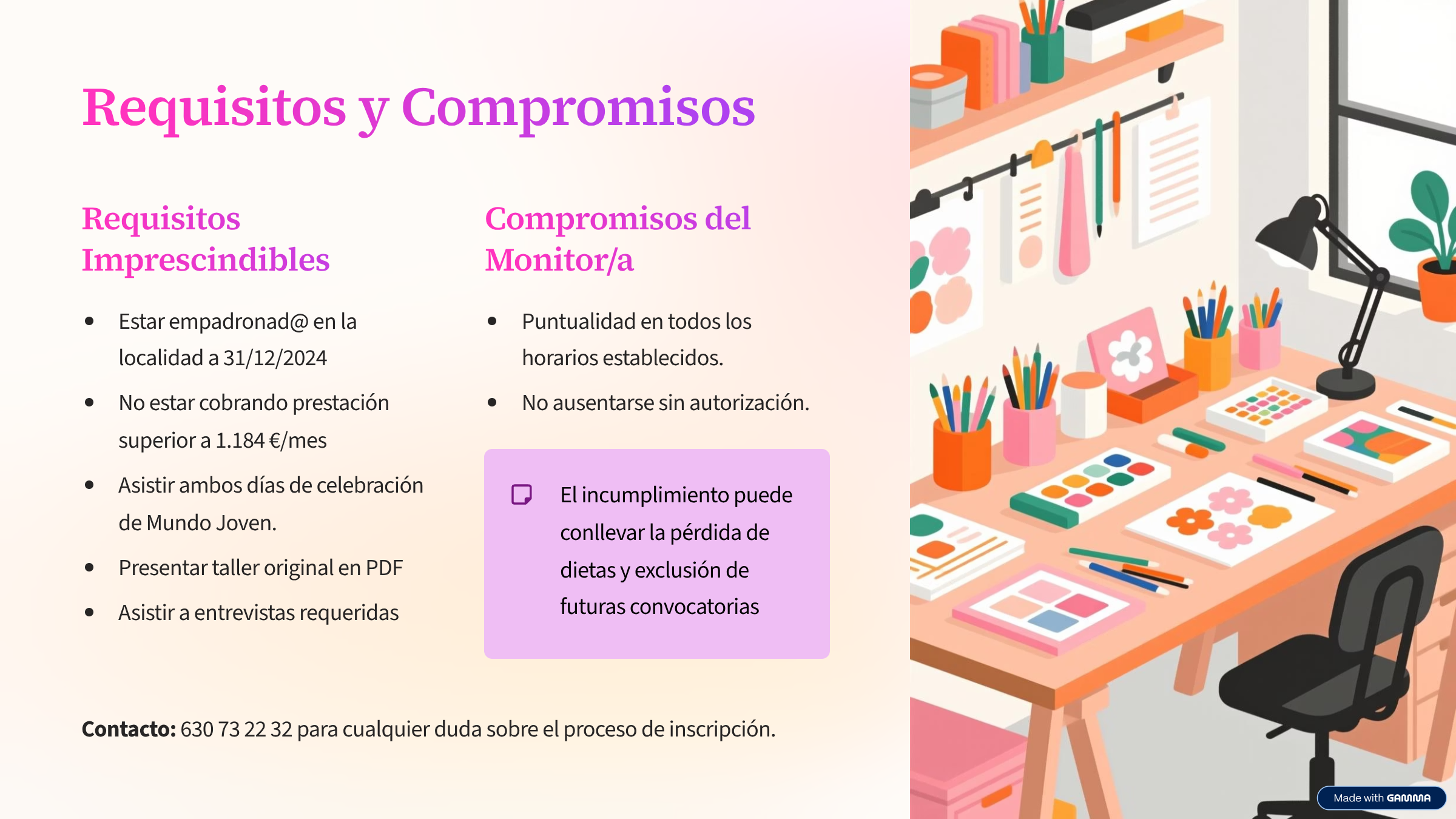 Para ello, será imprescindible PRESENTAR UN TALLER y que este taller sea uno de los elegidos para ser realizado en MUNDO JOVEN 2025.