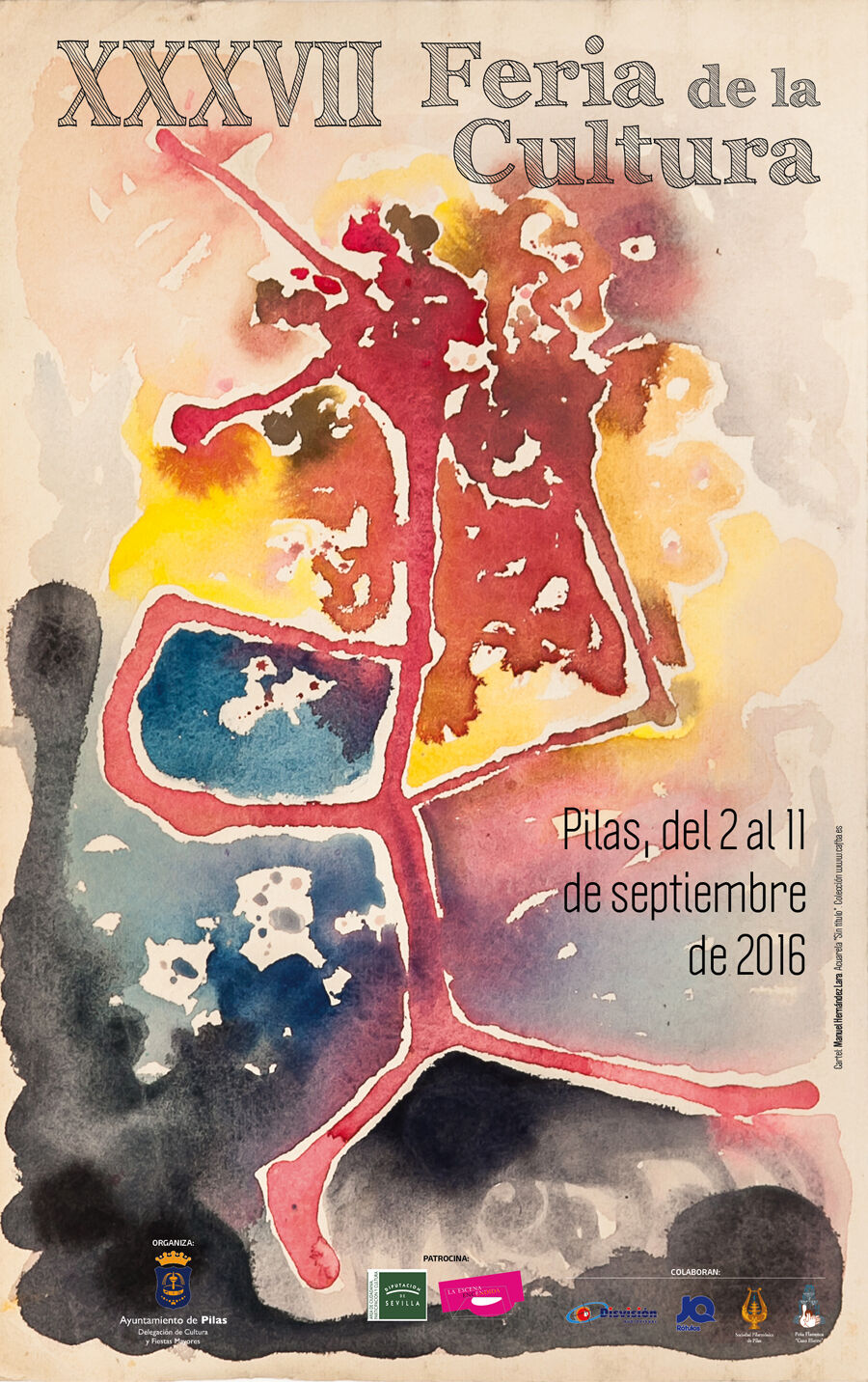 Cartel de la XXXVII Feria de la Cultura, obra de pintor pileño Manuel Hernández Lara (Pilas - 29-4-1946 - 03-04-2016). Sin título. 40 x 25 cms. Acuarela realizada precisamente en febrero de 2016, perteneciente a la colección www.cafba.es