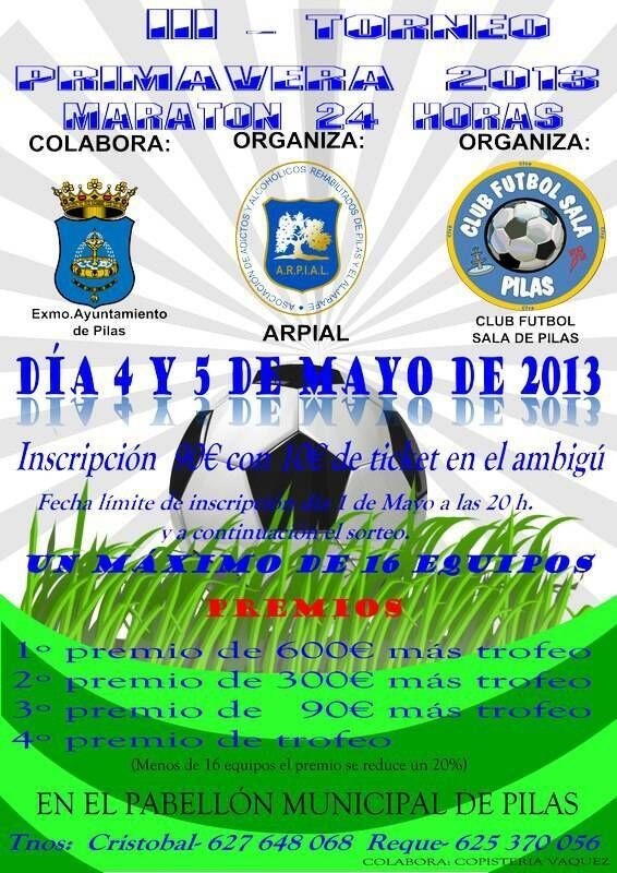 Este fin de semana se celebrará el III Torneo de fútbol Privavera 2013 oranizado por Arpial y el Club de Fútbol Sala de Pilas. La maratón 24 horas de fútbol tendrá lugar los días 4 y 5 e mayo en el Pabellón Municipal de Pilas.
