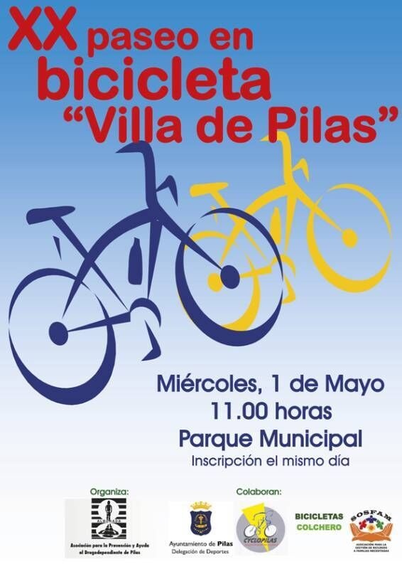 Este miércoles 1 de mayo tendrá lugar el tradicional Paseo en bici "Villa de Pilas" por las calles de nuestro pueblo. El requisito para participar será entregar un kilo de alimentos para colaborar con la organización solidaria SOSFAM.