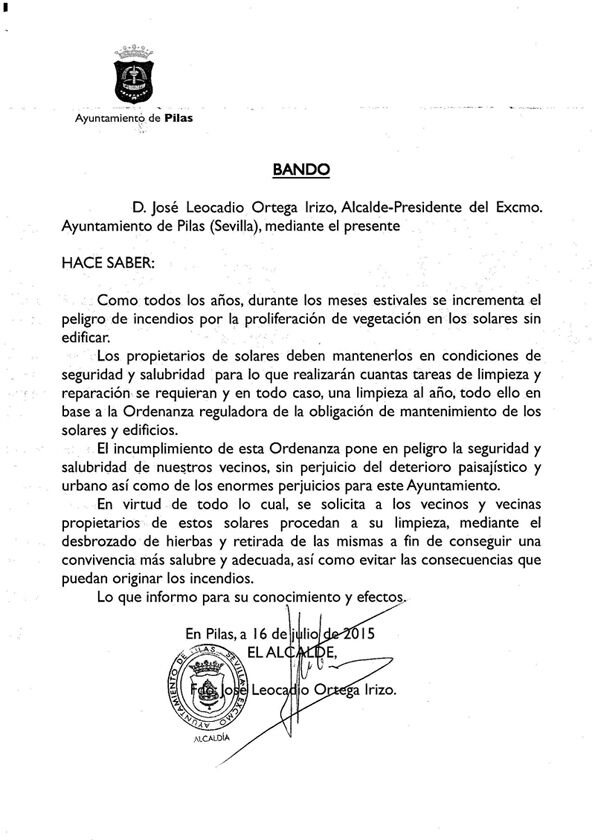 El alcalde de PIlas, José Leocadio Ortega, emite el siguiente bando para propiciar la limpieza de solares y contribuir a la salubridad y evitar peligros de incendios.