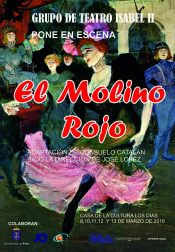 El grupo de teatro Isabel II escenificará El Molino Rojo , una adaptación de Consuelo López de la célebre obra Mouline Rouge y dirigida por José López en la Casa de la Cultura los siguientes días: