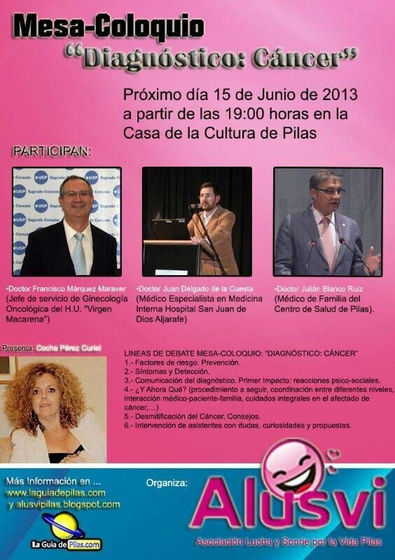 La Asociación Lucha y Sonríe por la Vida de Pilas ALUSVI, celebrará el próximo sábado día 15 de Junio, en la Casa de la Cultura de Pilas, una Mesa-Coloquio a partir de las 19h con el fin de estar informados frente al cáncer, como medio de suma importancia para la prevención, diagnóstico y afrontamiento de la enfermedad.
