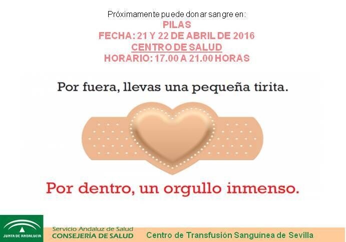 El Centro de Transfusión Sanguínea de Sevilla informa de que los próximos días 21 y 22 de abril, en el Centro de Salud de Pilas, se podrá donar sangre. Horario: de 17.00 a 21.00 horas.