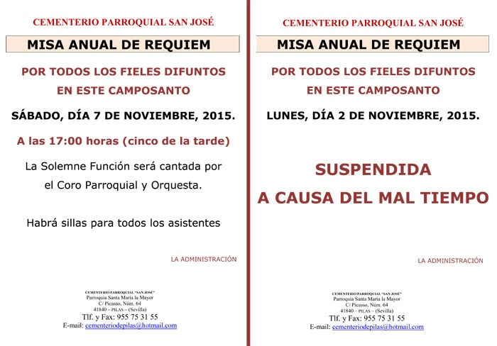 Por inclemencias meteorológicas, la se celebrará el sábado 7 de noviembre a las 17.00 horas, mientras que el Rosario será el domingo 8 a las 12.00 horas.
