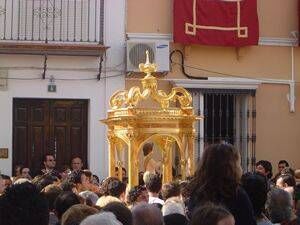 Arraigada fiesta religiosa cuyo origen contaba con la procesión de varias imágenes que se conservan en la Iglesia y de los populares “Tarsicios”. En la actualidad tiene lugar la procesión de la Custodia de plata realizada en 1858 en los talleres de Isaura, considerada una de las mejores “custodias de la provincia de Sevilla, acompañada por los niños que han recibido el Sacramento de la Comunión. La procesión sale a las 9 de la mañana, acompañada de una multitud de personas, las diferentes instituciones religiosas, en riguroso orden de antigüedad, las instituciones políticas y sociales y hacen un recorrido sencillo y tradicional, decorándose el suelo de las calles, ventanas y algunas calles con gallardetes, banderas y colgaduras.